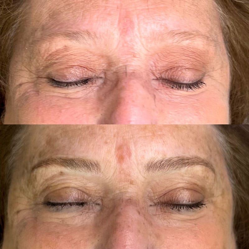 Within 10-14 days, the treated skin naturally exfoliates and sheds. Your brows will look lighter and somewhat patchy. Don’t panic! This is all part of the process. The pigment will become more visible around weeks 4-6, and any areas that still lack color can be filled in quickly during a follow-up appointment.